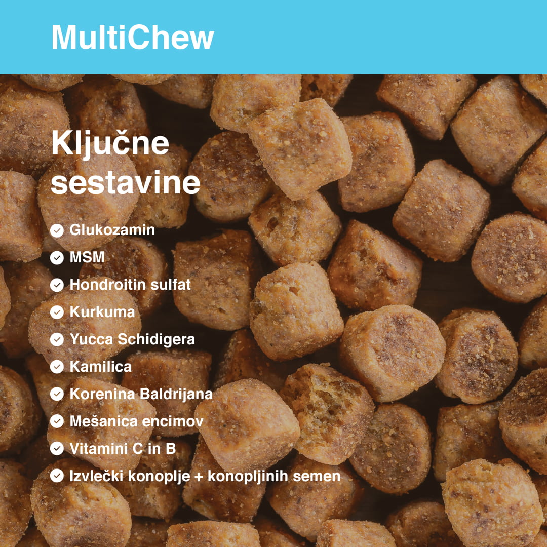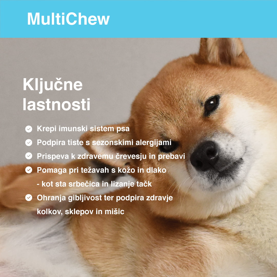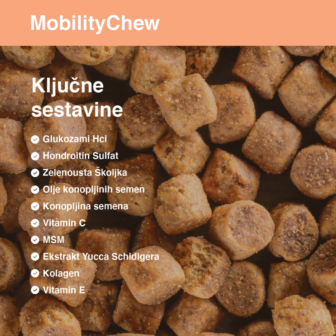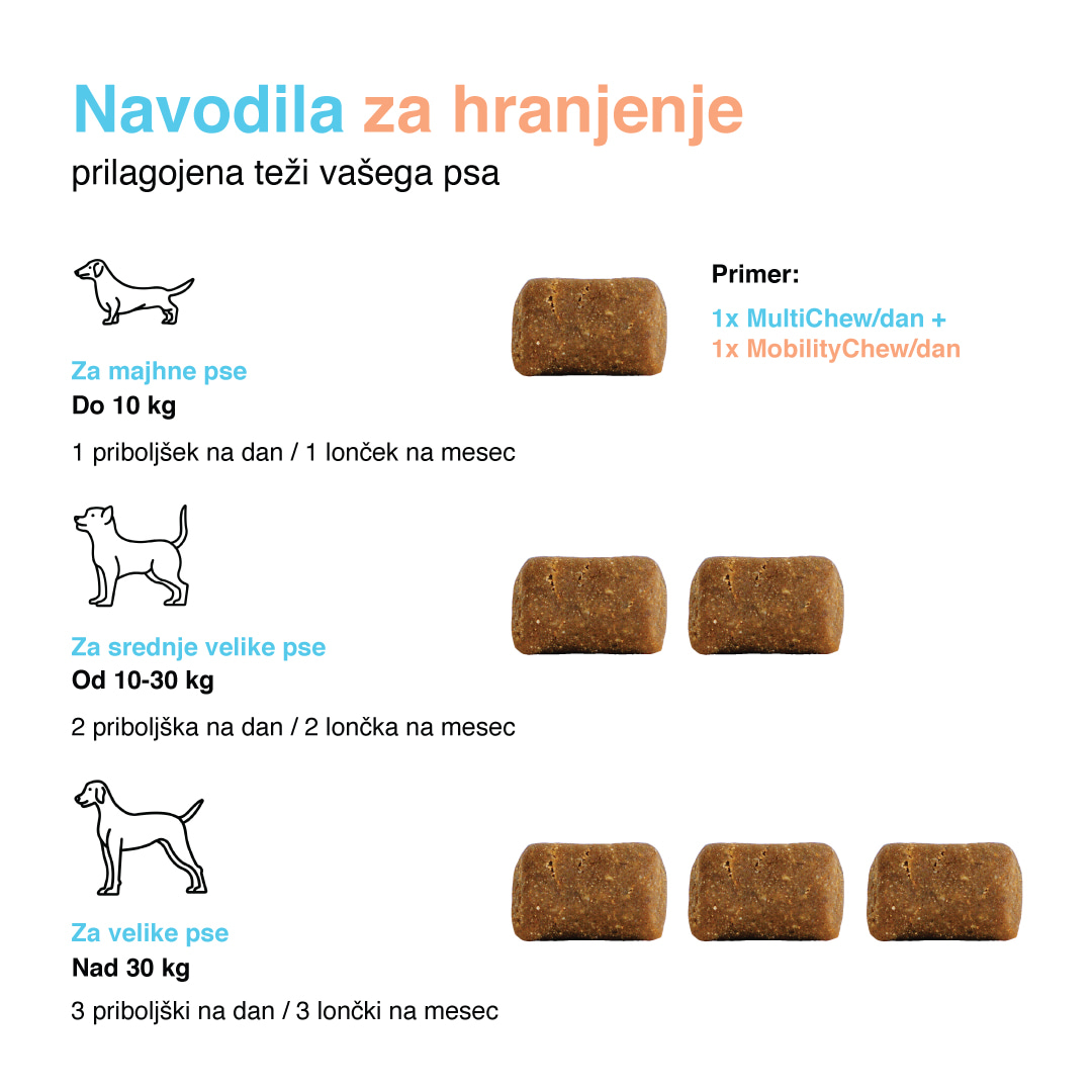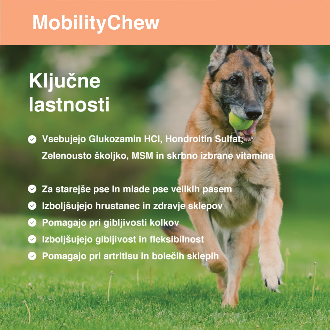 Podržite svog psa na sveobuhvatan način uz jedinstvene Multi Chews i Mobility Chews, posebno razvijene za jačanje imunološkog sustava, poboljšanje crijevnog zdravlja, ublažavanje sezonskih alergija te potporu pokretljivosti i zdravlju zglobova. Multi Chews djeluju iznutra prema van zahvaljujući mješavini vitamina, probiotika i hranjivih tvari koje doprinose optimalnom osjećaju blagostanja. Mobility Chews su obogaćene glukozaminom, hondroitinom i MSM-om – sastojcima koji podržavaju regeneraciju hrskavice, smanjuju upale i poboljšavaju pokretljivost. Ove ukusne poslastice pružaju cjelovitu podršku vašem psu, bez obzira na njegovu dob ili veličinu. Stručnjaci preporučuju da kod većih pasmina ovaj podržavajući sustav uvedete preventivno – već u odrasloj dobi. Neka vaš pas uživa u slobodnom i zdravom kretanju – bez ograničenja!