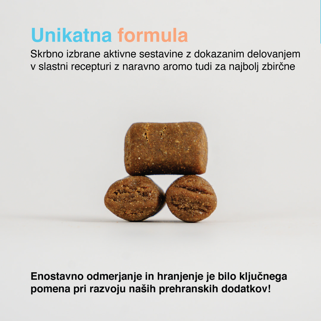 Jednostavno doziranje i hranjenje bili su ključni pri razvoju naših dodataka. Svaka poslastica sadrži savršeno izbalansiranu količinu aktivnih sastojaka za psa do 10 kg tjelesne mase. Za pse s većom težinom jednostavno povećajte broj poslastica: